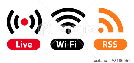 ライブとワイファイとRSSアイコンセット。ベクター。