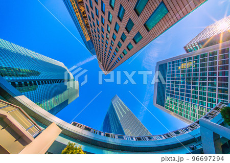 日本の東京都市景観 汐留の新風景。秋晴れの青空が広がる汐留のオフィス群やビルに反射する太陽光