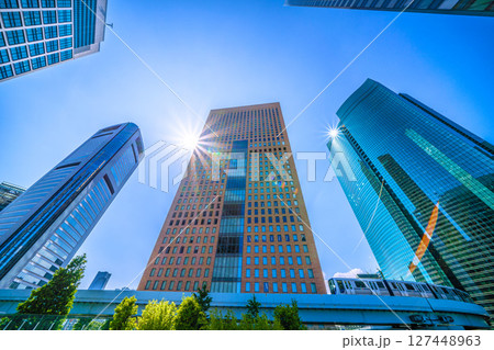 日本の東京都市景観 新風景…暑い…汐留のビジネス街や太陽光、ゆりかもめ、汐留駅…希望の光=7月20日