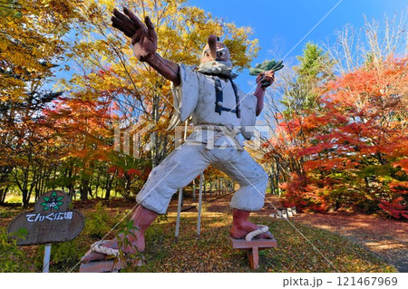 信州 飯綱町霊仙寺湖畔の紅葉と青空に映える天狗様 迫力満点