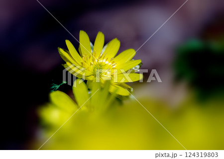 霊仙岳南西尾根の下部に咲くフクジュソウと春の光