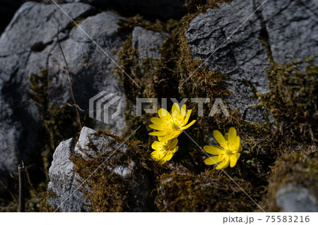 早春の霊仙岳南西尾根の石灰岩地帯に咲き始めたフクジュソウ