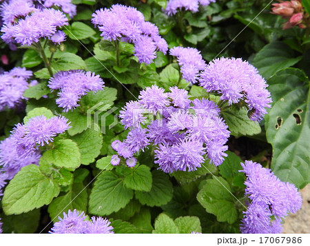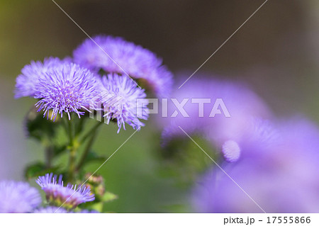 秋の庭に咲く紫色のアゲラタムの小さな花