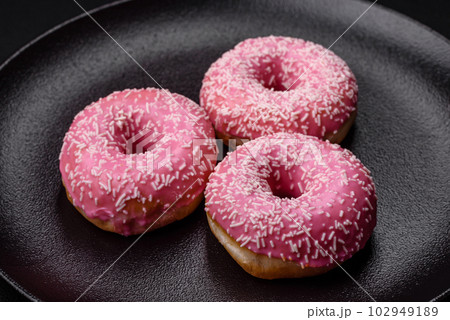 Pastries concept. Donuts with chocolate glaze with sprinkles, on a dark concrete table