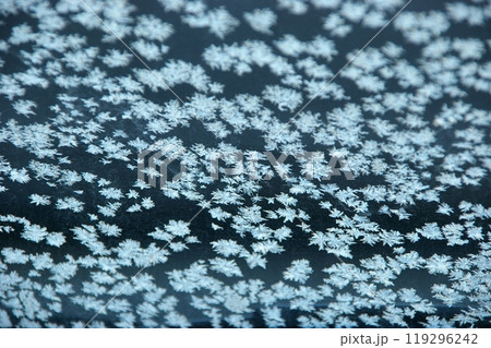 寒い氷点下の朝薄い氷の池のたまりに霜花の結晶3