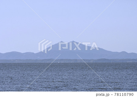 青空の下、霞ヶ浦湖畔の天王崎公園から望む筑波山