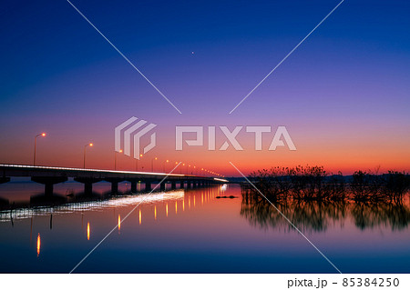 茨城県行方市霞ヶ浦と霞ヶ浦大橋の夕景