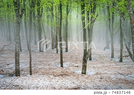 新潟県長岡市・道院高原 残雪の霧に霞むブナ林と芽吹きの幻想的な風景