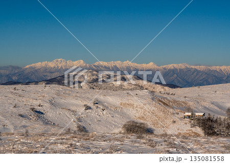 霧ケ峰高原の雪原遊歩道から北アルプス雪景色