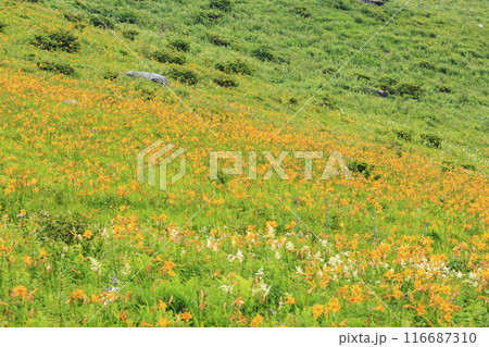 霧ヶ峰高原 車山肩ビーナスの丘に咲き誇るニッコウキスゲの花(アップ)