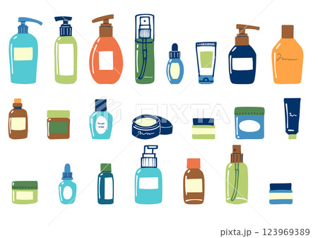 手書きの化粧品やスキンケア用品のボトルのイラスト素材セット