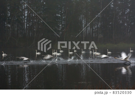 Blurred photo of autumn dark landscape on a foggy river with a white flying up swans. Finland, river Kymijoki.