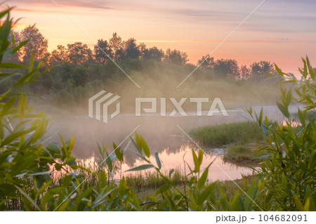 Beautiful spring sunrise over river banks. Morning fog in the forest