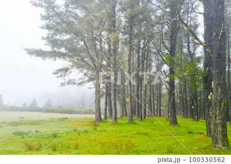 Canadian rain forest with green trees. Early morning fog in winter season.