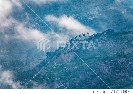 Majestic view on beautiful fog and cloud mountains in mist lands