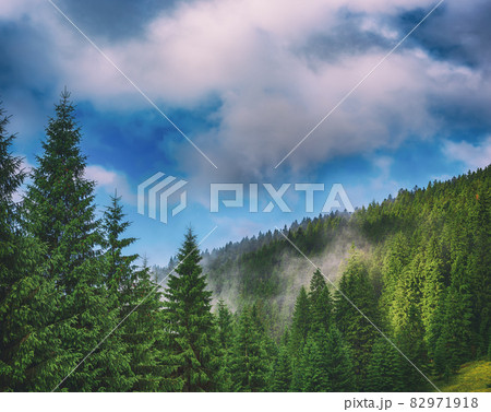 Thick white clouds over mountains covered with green forest. green trees in a small white fog nature outdoors.