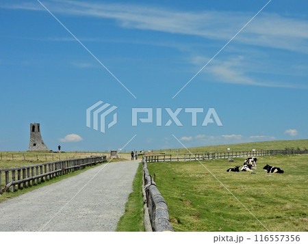 美しの塔と草を食む放牧牛のいる美ヶ原パノラマコース