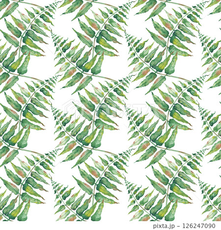 Seamless pattern with a hand-drawn green fern. Watercolor illustration of leaves of a forest plant on a white background. It is suitable for the design of a forest theme, as well as packaging