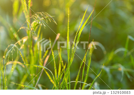 Morning Dew Glistening on Lush, Vibrant Green Grass in the Early Hours of Daylight