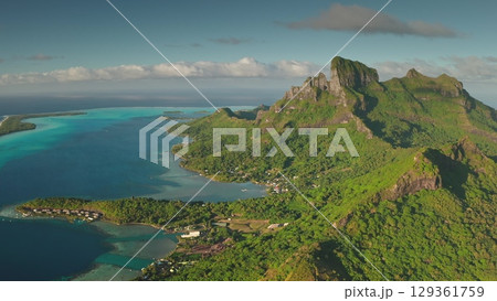 Aerial view of mountain Otemanu and surrounding coastline, showcasing the vibrant turquoise lagoon water and lush green tropical vegetation of Bora Bora island in French Polynesia. Travel background