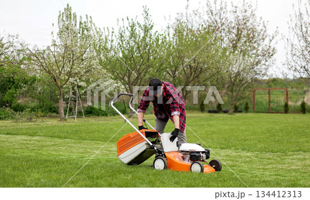 Man in casual clothes takes out bag with cut grass of lawn mower after mowing lawn with at own backyard. Husband takes care of garden. Modern gasoline garden equipment. Landscaping work at home