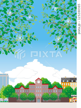 新緑の葉が茂る校舎のイラスト.