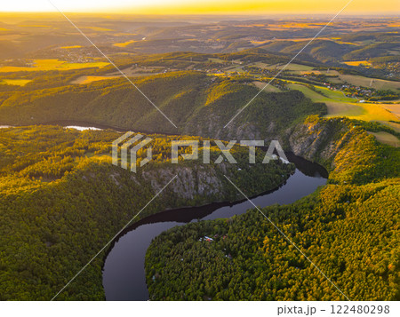 As the sun sets over the Vltava River, warm hues reflect on the water, illuminating the lush landscapes and casting long shadows across the hills, showcasing natural beauty of Czechia's countryside.