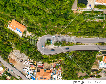 Aerial image of a sharp hairpin turn on a lush green road in Amalfi, Italy, with vehicles, orange roofed buildings, and boats near the coastline.