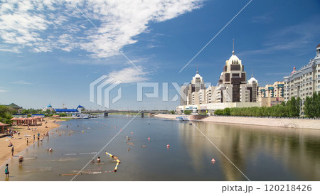 People are bathing in a river along an artificial beach timelapse hyperlapse and skyline of Astana, Kazakhstan