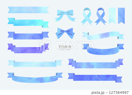 青いリボンのイラスト素材セット(水彩風ベクター)