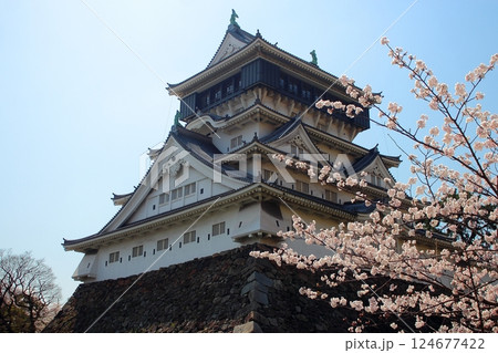 青空に小倉城と満開の桜の花