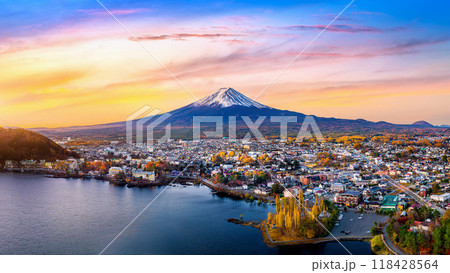 Fuji mountain and Kawaguchiko lake at sunrise, Autumn seasons Fuji mountain at yamanachi in Japan.