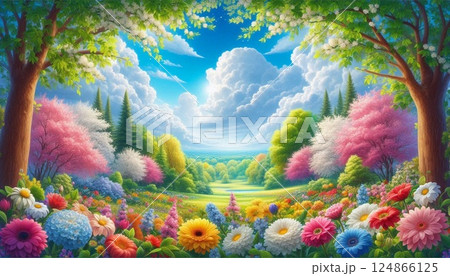 春の公園に咲くカラフルなチューリップの花やパンジーの花や桜の花