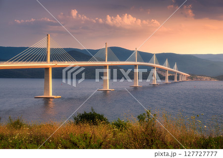 Modern Peljesac bridge and blue sea at colorful sunset in summer