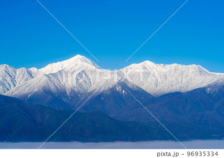 【雲海素材】初冬の降雪した北アルプスと雲海と青空【長野県】