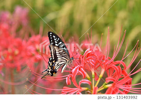 赤い彼岸花で蜜を吸うアゲハチョウ