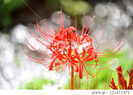 小川の水面に反射する太陽光をバックに咲く紅い彼岸花
