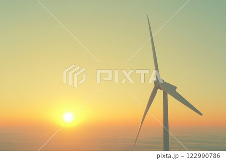 A wind turbine is standing tall in the sky above a beautiful sunset