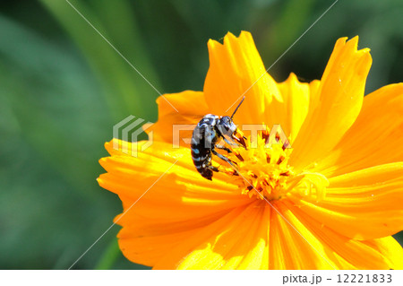 キバナコスモスの花に止まるルリモンハナバチ