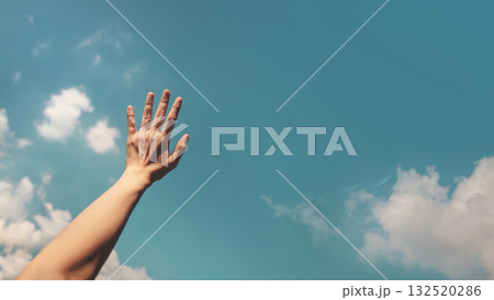 Hand reaching toward the bright blue sky, symbolizing freedom, hope, positivity