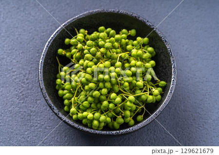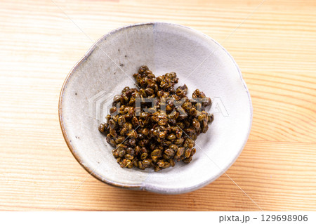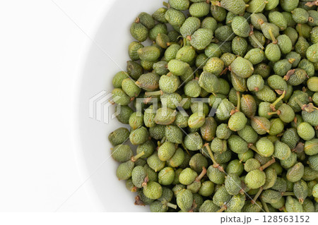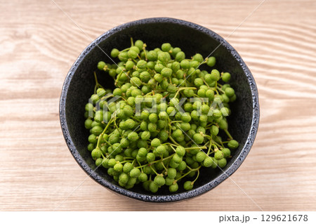 お皿に入った山椒の実(実山椒)のクローズアップ