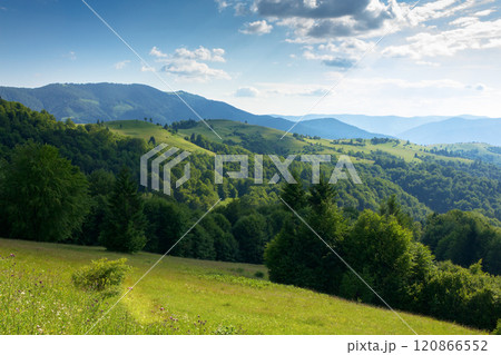 mountain landscape in summer. beautiful countryside with green meadows and rolling hills. sunny afternoon