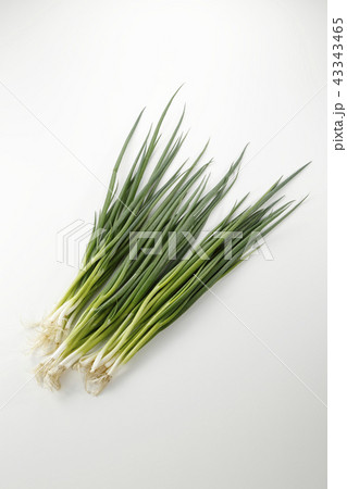 竹ざるに乗せた福岡県産小ねぎ 白バック 白背景