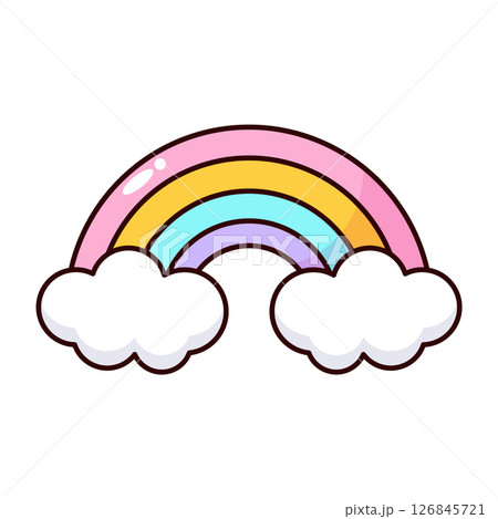 A colorful cartoon rainbow with pastel colors and fluffy white clouds underneath.
