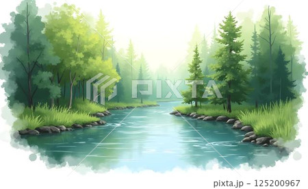 A beautiful watercolor scene of a river meandering through a rich, green forest landscape