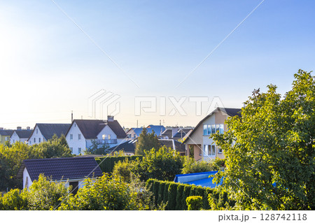 Brest Belarus colorful village streets with wooden huts brick houses .