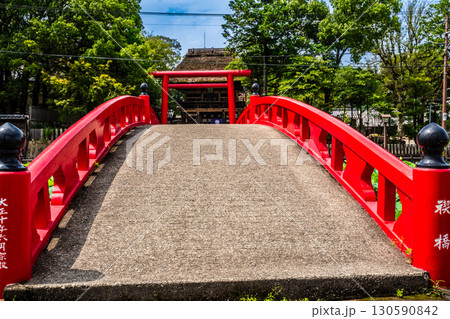 境内から観える楼門と稲荷神社鳥居風景「茅葺きの社寺建造物としては唯一国宝の青井阿蘇神社」(人吉市)