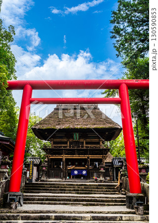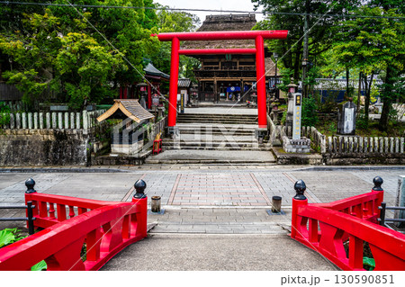 境内から観える楼門と稲荷神社鳥居風景「茅葺きの社寺建造物としては唯一国宝の青井阿蘇神社」(人吉市)