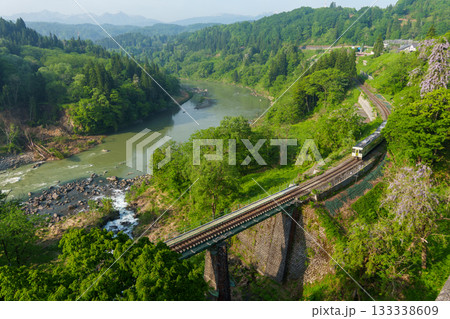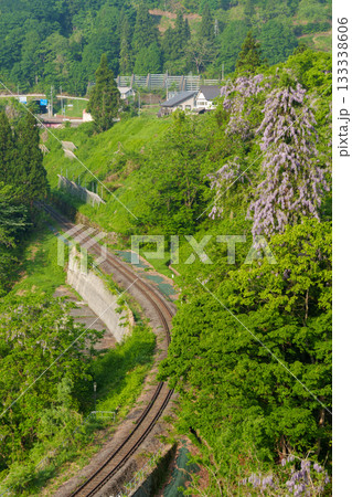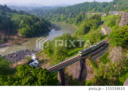 新緑の青倉地区を走り抜ける飯山線の気動車