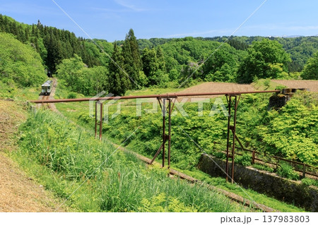 永く田畑を支えてきた赤茶けた送水管とその下をくぐる飯山線の気動車